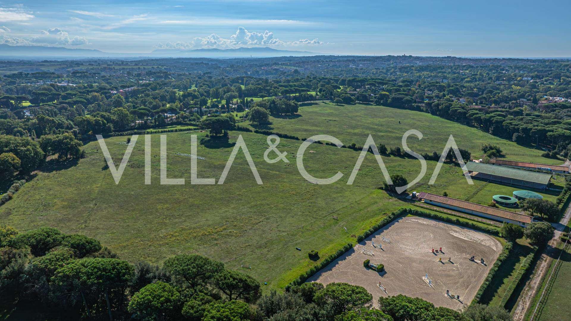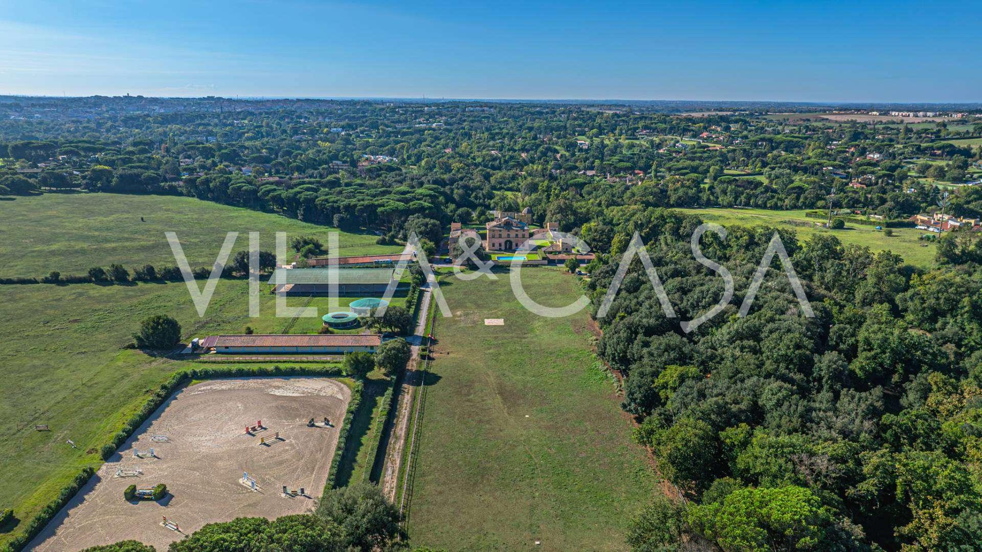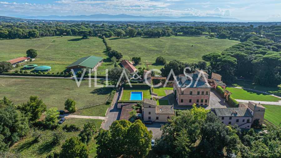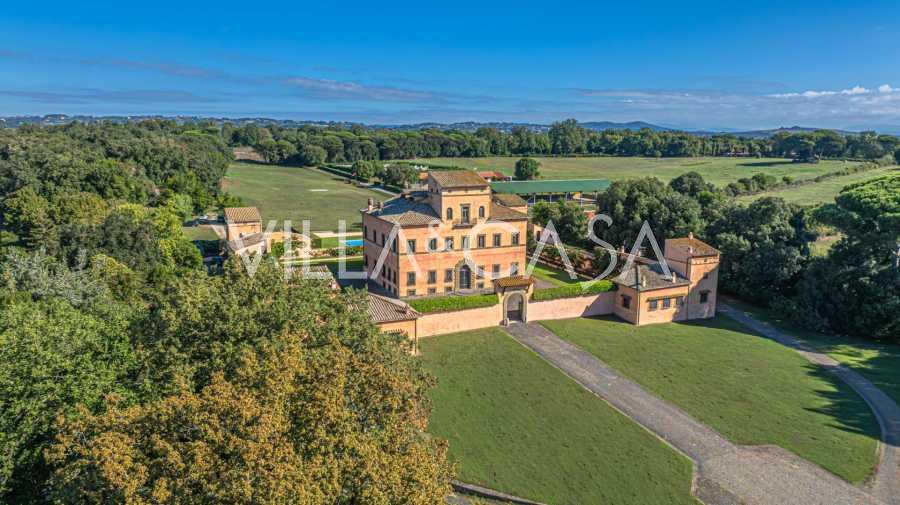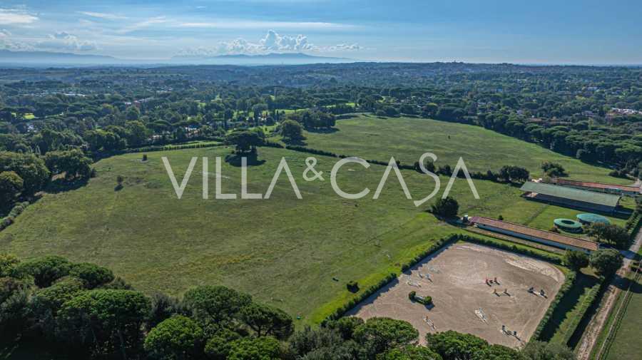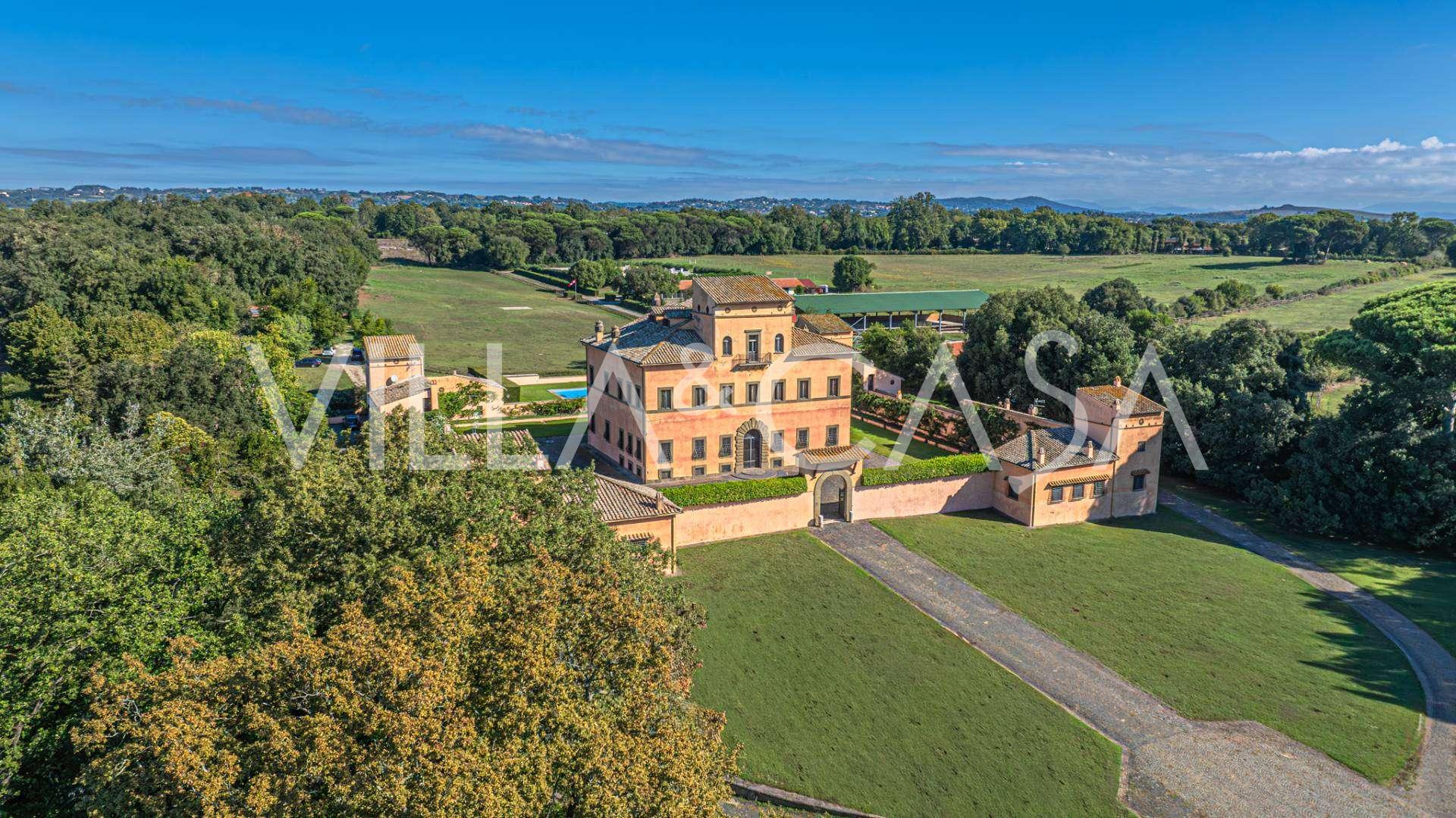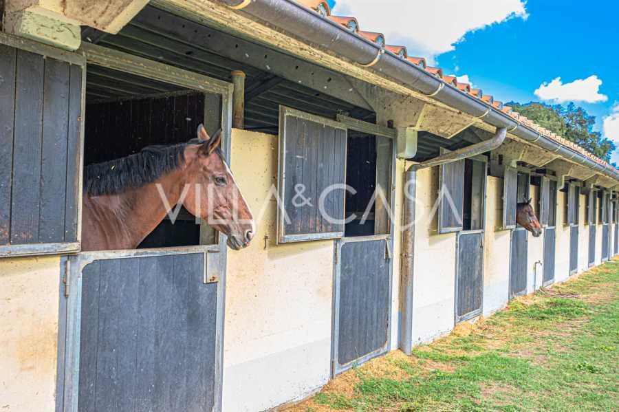 ローマから北へわずか20キロに位置するこの城は、30ヘクタールの手入れの行き届いた草原と古代の森林に囲まれ、自然との完全な調和と隠遁の雰囲気を作り出しています。ここでは、伝説の競走馬リボットが生まれました。馬術施設は国際的な最高水準で整備されており、23と25の馬房を持つ2つの厩舎には、鞍部屋、馬の手入れゾーン、スタッフ用の快適なアパートメントが備わっています。施設内には、屋内馬場、屋内カルーセル、広大な放牧地があり、トレーニングや競技に理想的です。城はヨーロッパで最も権威のあるゴルフクラブの一つに隣接しており、専用のヘリポートもあります。敷地内には古代エトルリアの洞窟があり、特別な魅力と歴史的価値を与えています。