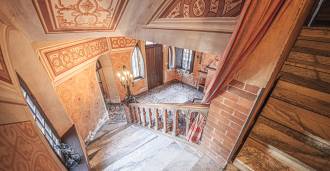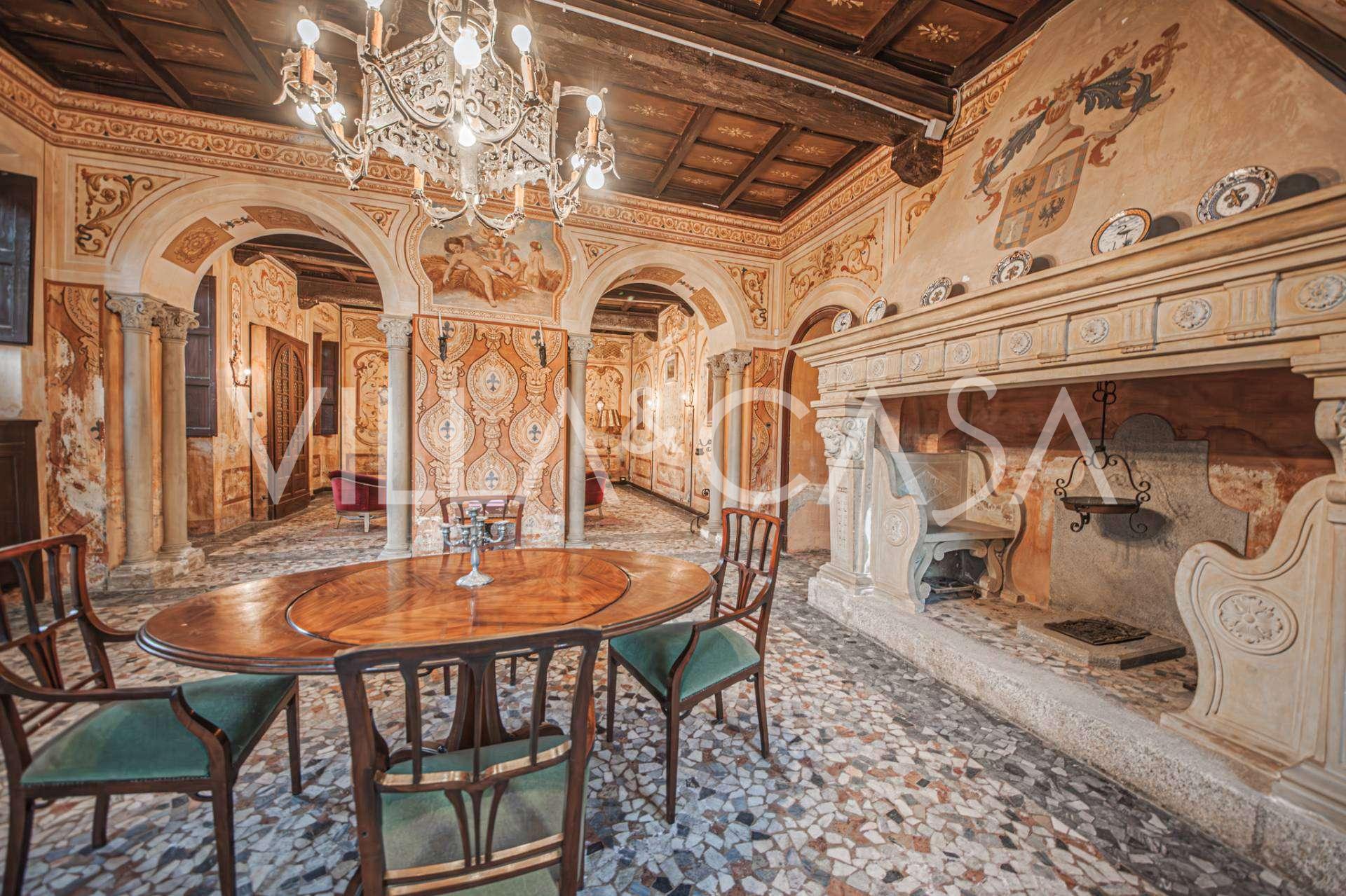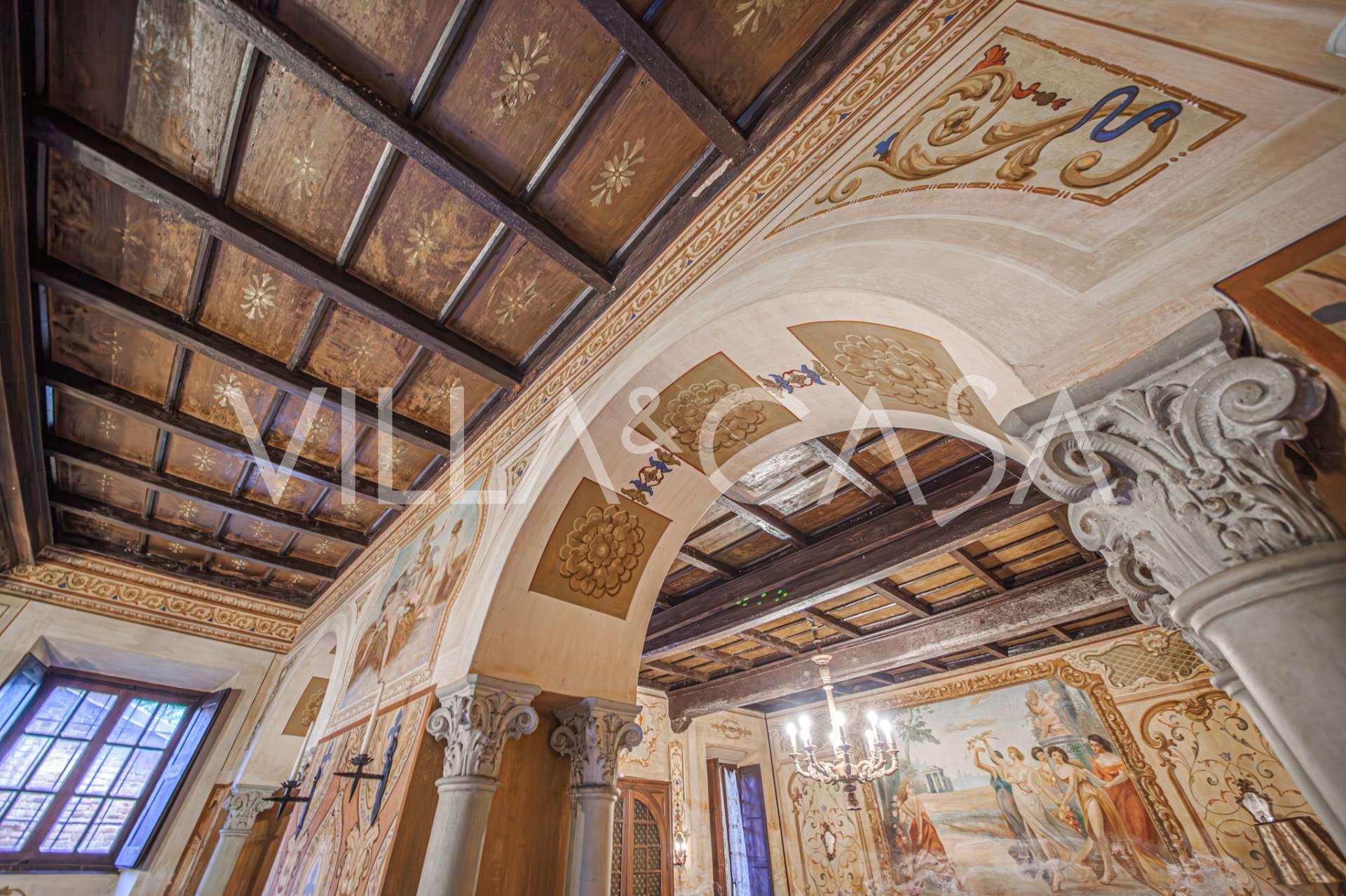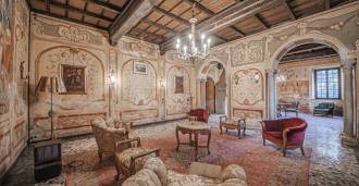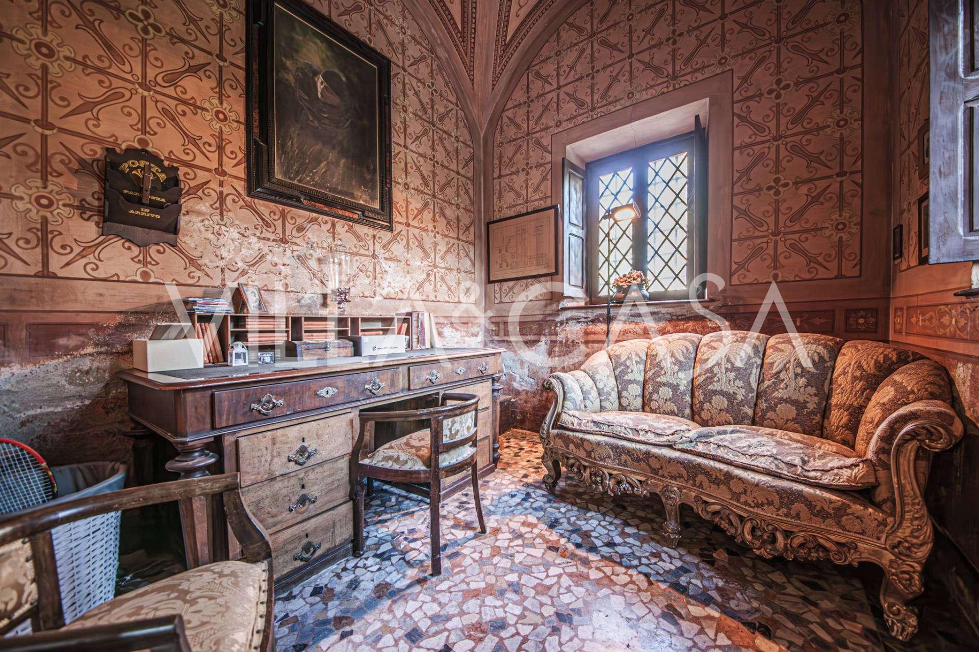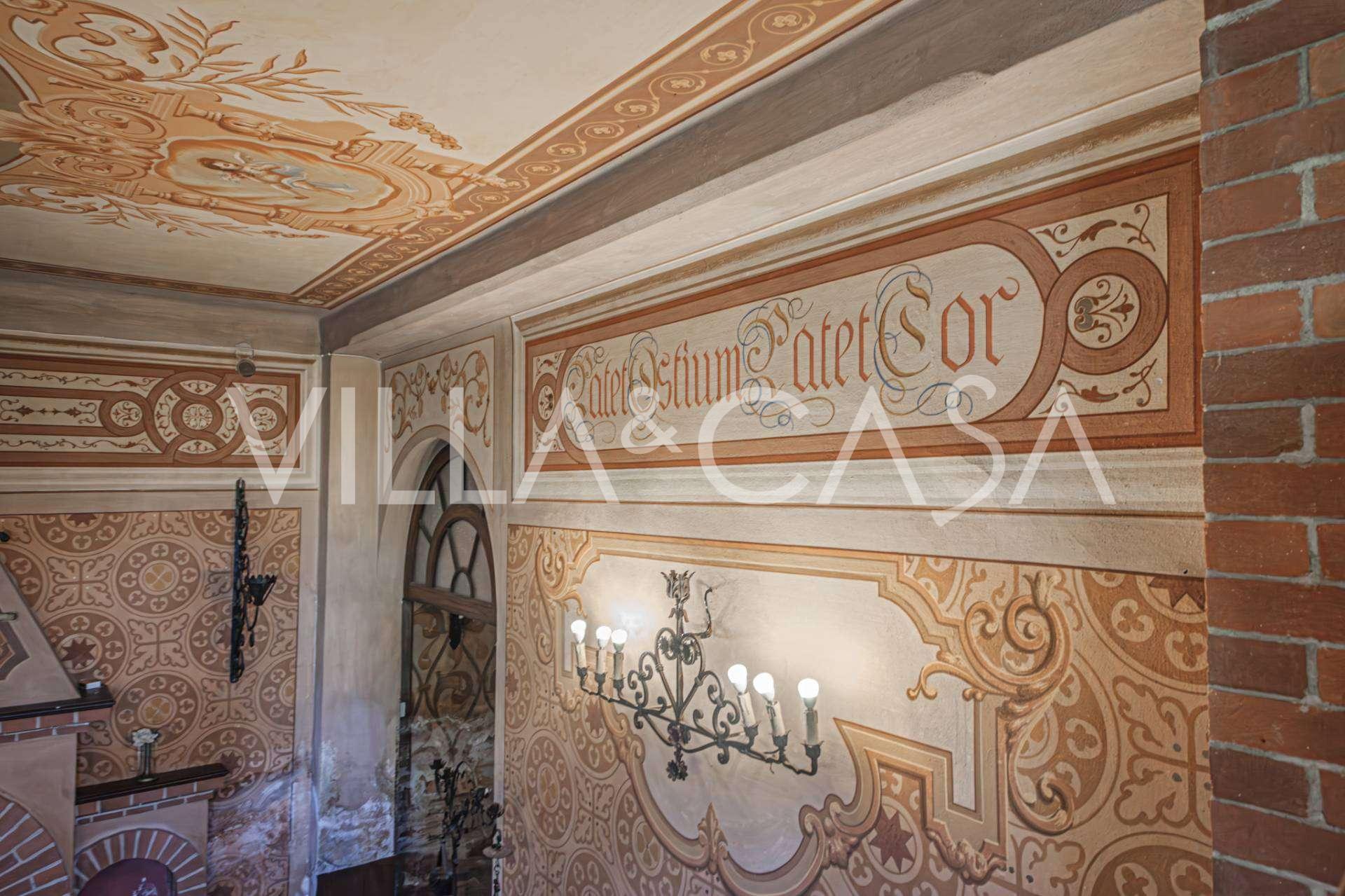 城のインテリアは、古代の壮麗さで訪問者を驚かせます。暖炉やフレスコ画のあるアンフィラード、絵画が施された古いホール、そして上階のアパートメントへと続く優美な階段があります。1階にはリビングルーム、塔の基部にある書斎、ダイニングルーム、キッチン、ゲスト用トイレがあり、テラスからは庭の景色を楽しむことができます。