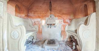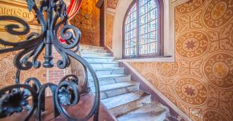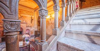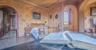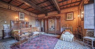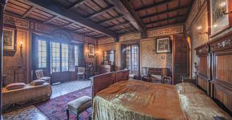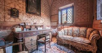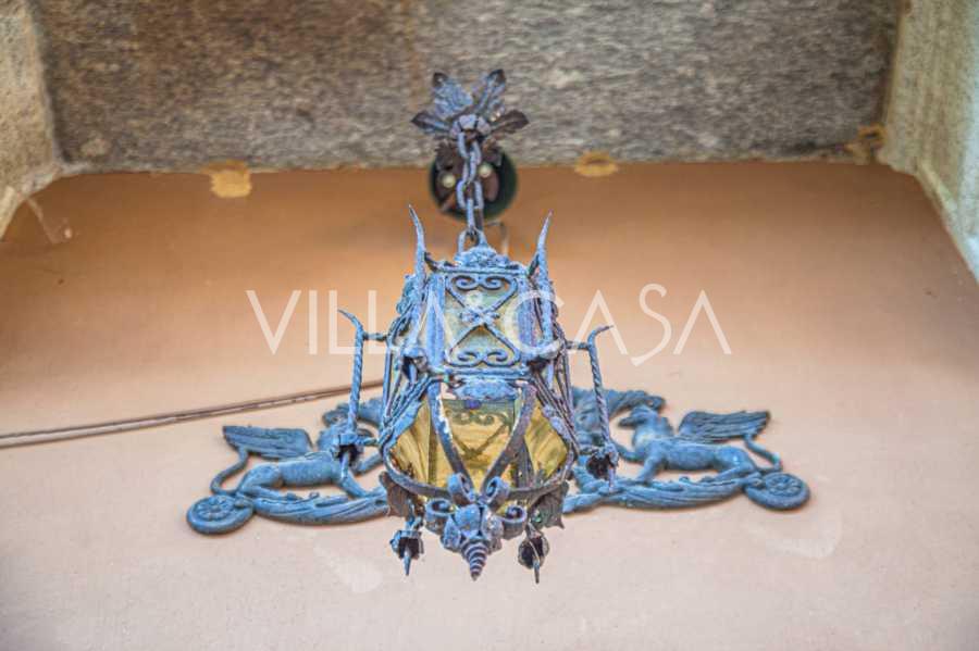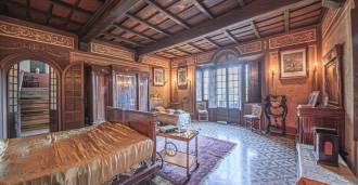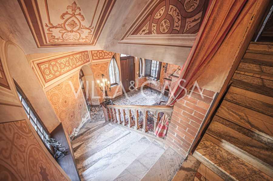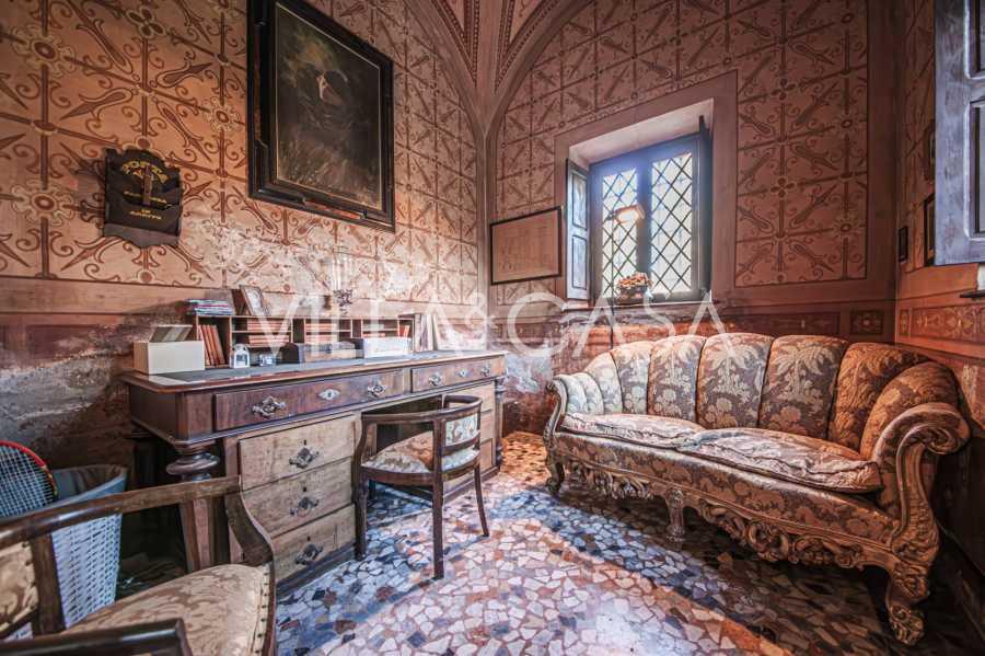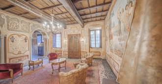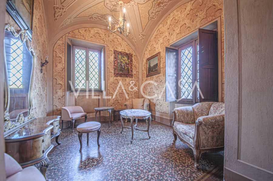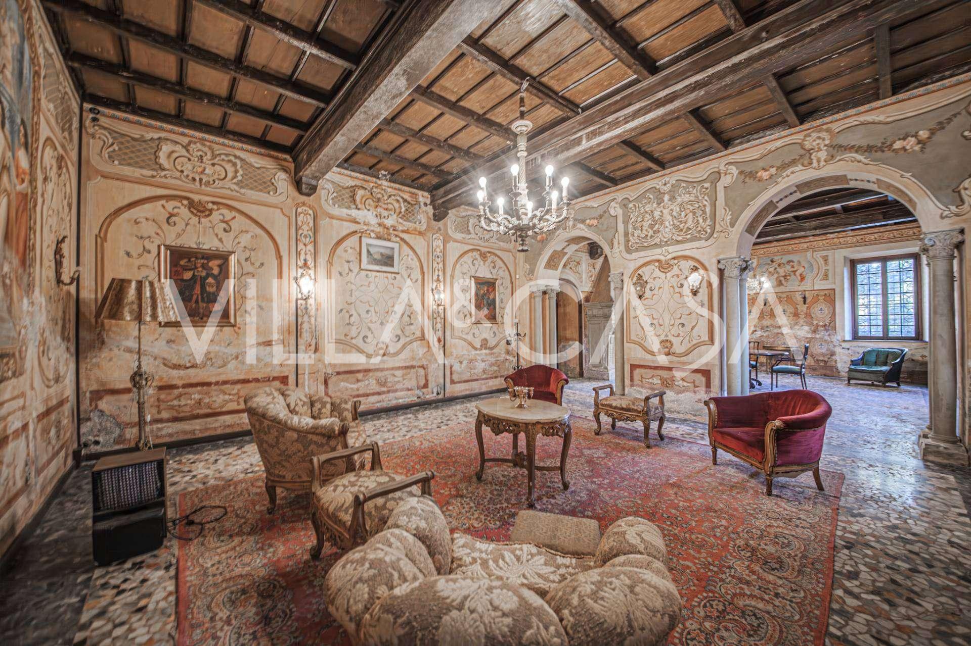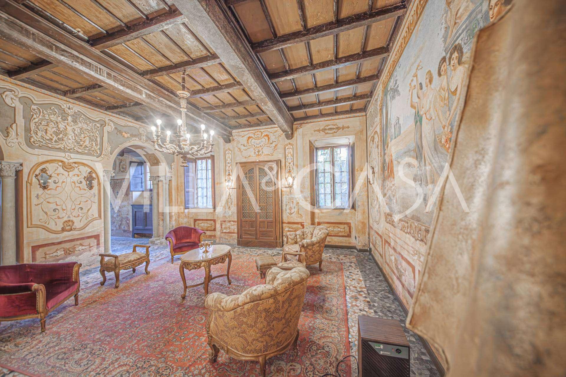城のインテリアは、古代の壮麗さで訪問者を驚かせます。暖炉やフレスコ画のあるアンフィラード、絵画が施された古いホール、そして上階のアパートメントへと続く優美な階段があります。1階にはリビングルーム、塔の基部にある書斎、ダイニングルーム、キッチン、ゲスト用トイレがあり、テラスからは庭の景色を楽しむことができます。
